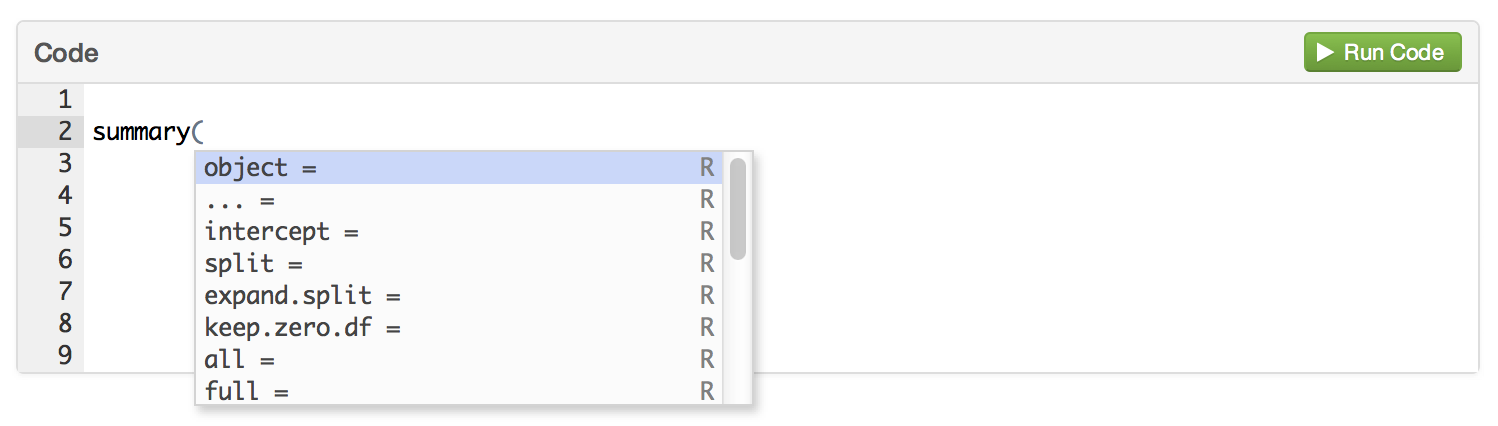 You can optionally disable code completion (either globally or on a per-chunk basis) using the exercise.completion option. For example, the following illustrates turning off completions globally then enabling them for an individual chunk: