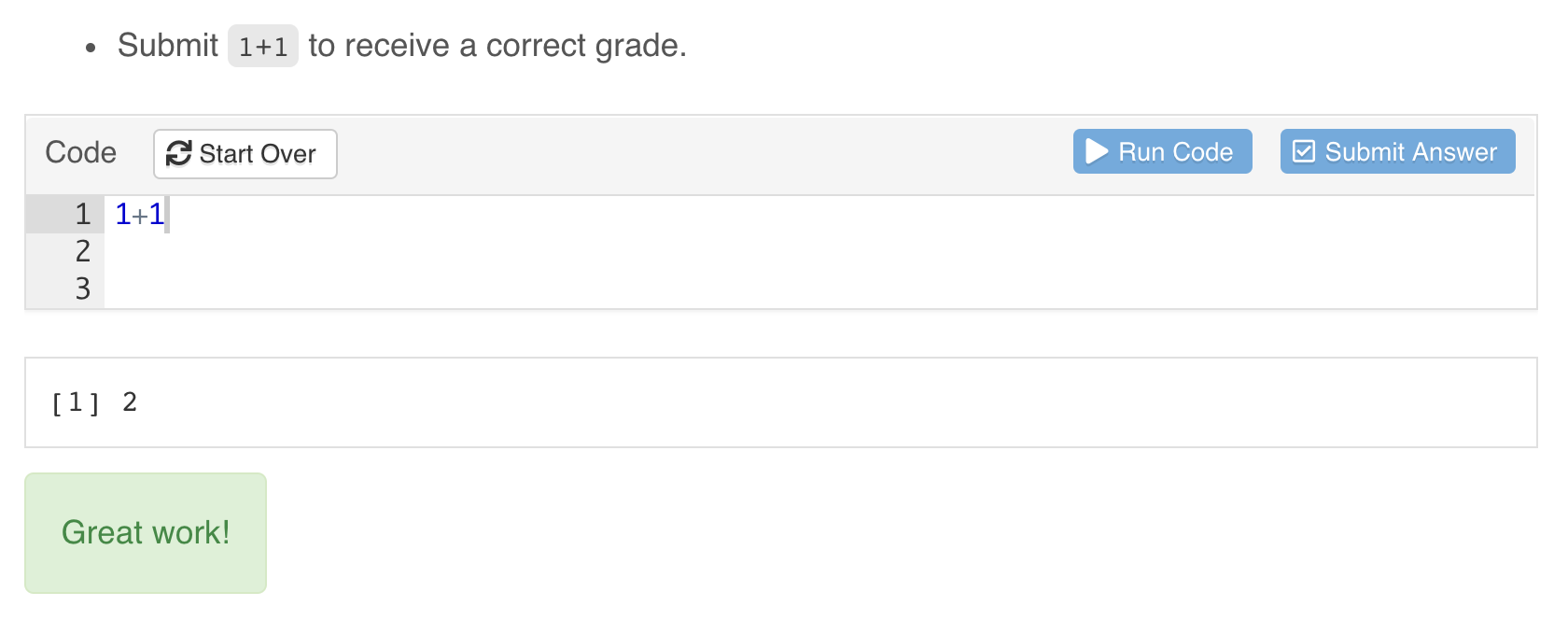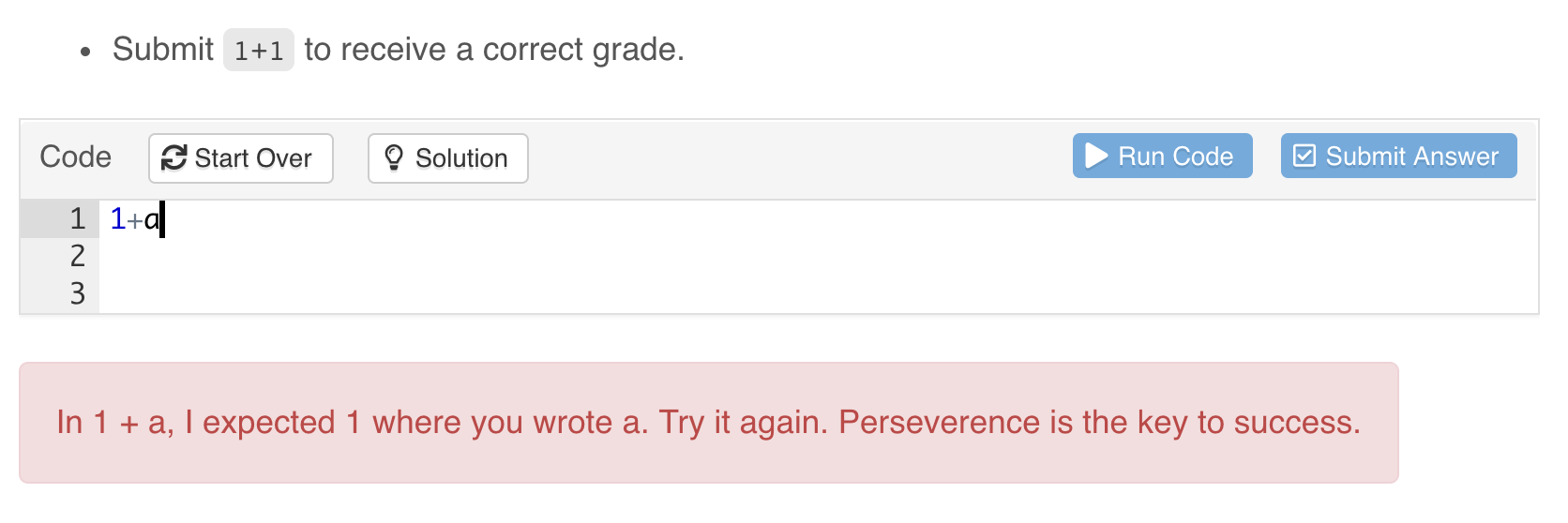 Submitted code with blanks will still be evaluated, but the other exercise checks will not be performed. This lets the student see the output of their code—which may produce a valid result—but still draws the student’s attention to the code that needs to be completed.