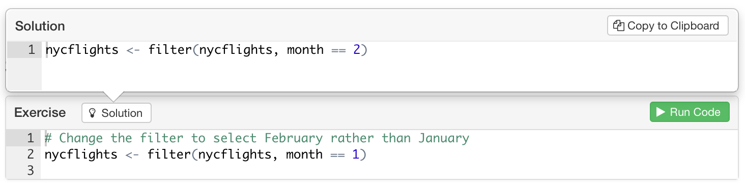 -solutionchunks enable you to provide a solution to the exercise that can be optionally viewed by users of the tutorial.Exercise