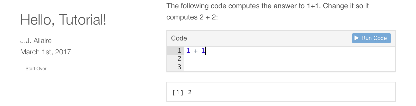 Then, call library(learnr) within your Rmd file to activate tutorial mode, and use the exercise = TRUE chunk option to turn code chunks into exercises. Users can edit and execute the R code and see the results right within their browser.